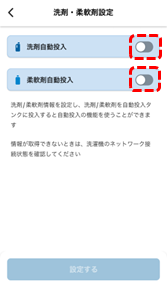 洗剤・柔軟剤設定画面の 洗剤自動投入・柔軟剤自動投入の右側のボタンをタッチしてください。