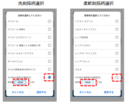基準量設定の場合は 「その他の洗剤(手動設定)」や「その他の柔軟剤(手動設定)」を選び「設定された投入量」をタッチしてください。