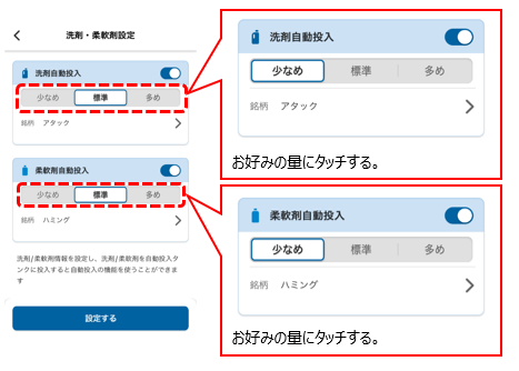 洗剤・柔軟剤投入量「少なめ」「標準」「多め」の設定方法