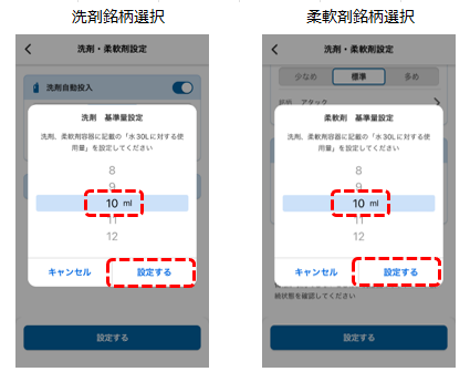 洗剤・柔軟剤容器に記載の「水30Lに対する使用量」を選択し「設定する」をタッチしてください。