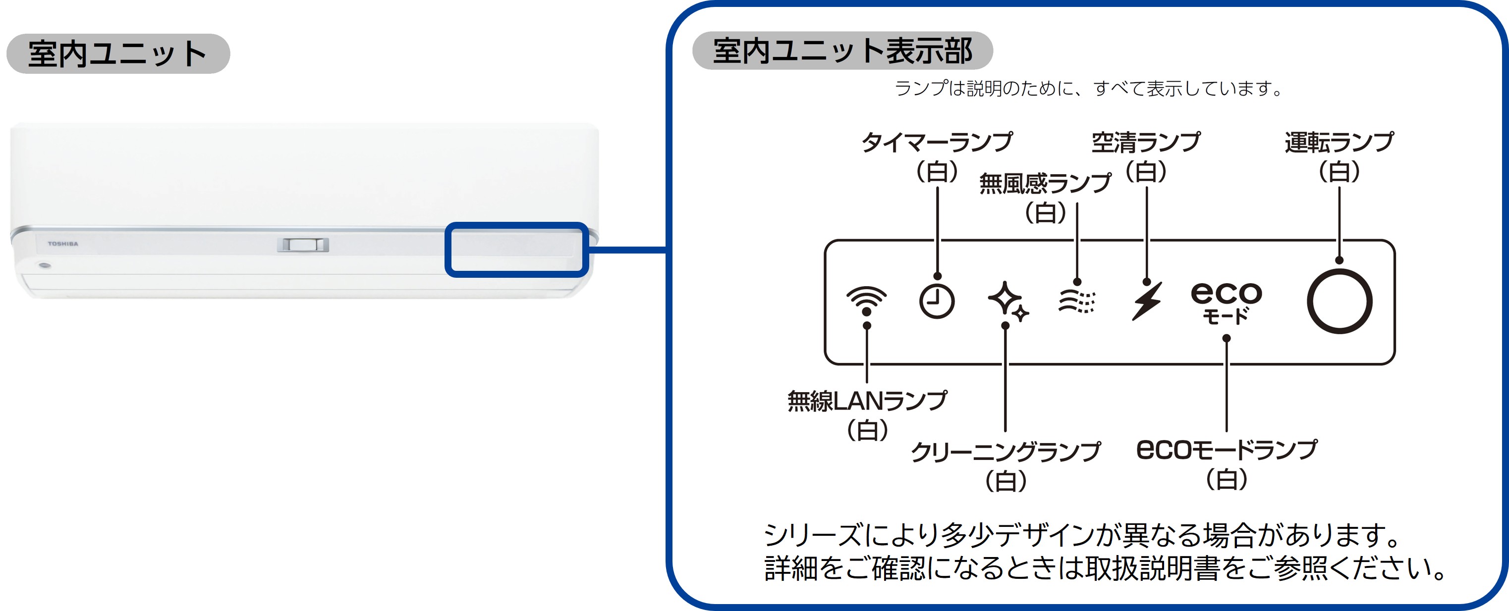 室内ユニット表示部には運転状況をお客様にお知らせするためにランプがあります。