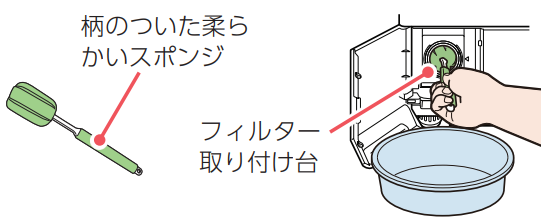 フィルター取り付け台の内側に汚れがついている場合は、柄のついた柔らかいスポンジを使って、汚れを取りのぞいてください。