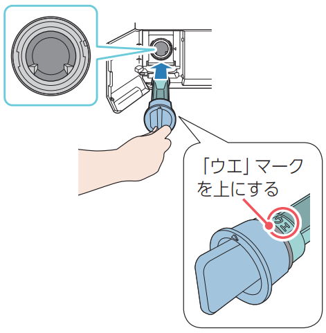 ⑥止まるまでツマミを右に回し、本体側の◁印と向き合っていることを確認し、ふたを閉めるきちんとはめ込まれていないと、「排水フィルターがはずれています(C26)」が表示されて運転できません。