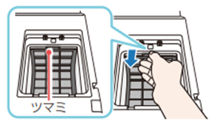 2.乾燥内部フィルター奥側上部のツマミを手前に引いて乾燥内部フィルターを取りはずす