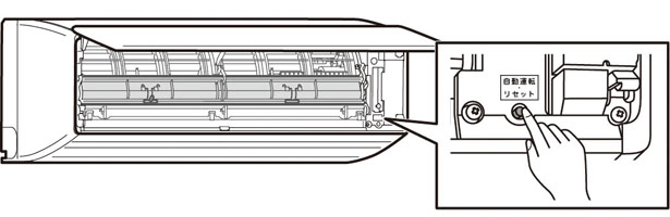 5. 室内ユニットの前面パネルを開け、「自動運転・リセット」ボタンを約1秒押す