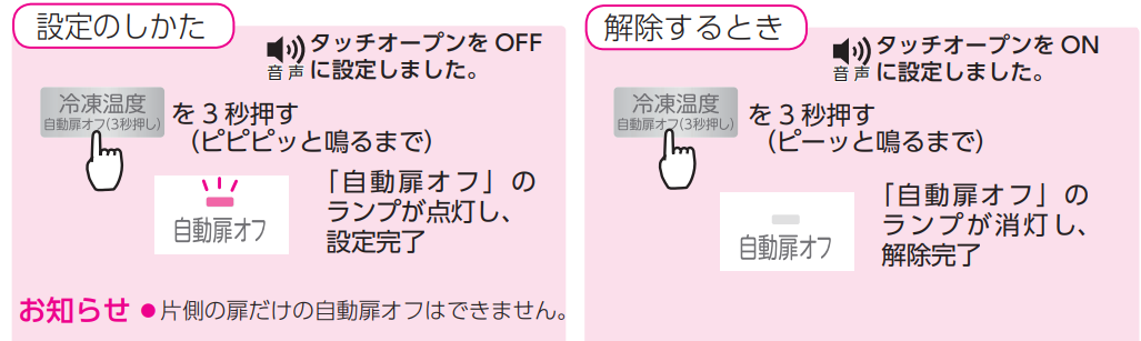 タッチオープン(自動扉)搭載機種は庫内操作パネル・コントロールパネルでオンまたはオフの設定ができます。お使いの冷蔵庫の機種(形名)を確認し操作してください。 ・お使いの冷蔵庫の機種(形名)の調べ方はこちらから ・取扱説明書のダウンロードはこちらから 【庫内操作パネルタイプ】・GR-Y***XFSの場合 ・GR-Y***FZ/GT/GTL/GTM/GTML・GR-W***FZS/FZ/GT/GTL/GTM/GTML/GZ/GZLの場合※機種により庫内操作パネルの表記が異なります。詳しくは取扱説明書をご確認ください。 【コントロールパネルタイプ】・GR-U**GXH/GXHLの場合